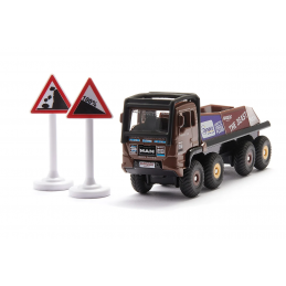 El camino es extremadamente empinado. Los gruesos neumáticos apenas tienen agarre a pesar del cambio todoterreno y la tracción total de cuatro ejes. Listo, ahora es el momento de pasar sobre la roca. Lo que es inimaginable para un camionero es el desafío especial y la emoción para el conductor y los espectadores en la prueba de camiones. El HS Schoch 8x8 MAN Truck Trial está desarrollado y diseñado para un uso todoterreno extremo en competición. El vehículo del ocho veces campeón de Europa de trial de camiones está revestido con los adhesivos originales del patrocinador y está equipado con la barra antivuelco exterior. Con los dos carteles incluidos en el paquete se puede transformar la habitación infantil en un campo de prueba.