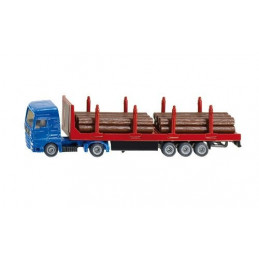 Una vez finalizado el trabajo en el bosque de vivero con los modelos SIKU de cosechadora, autocargador y tractor con remolque forestal, todavía queda transportar la cosecha del bosque al aserradero. De ello se encarga la extremadamente potente cabeza tractora MAN con remolque para transporte de madera. La pared protectora frontal y los montantes laterales garantizan el transporte seguro de los troncos de plástico incluidos como carga. El modelo rueda sobre ruedas de goma con diseño de llanta de camión.